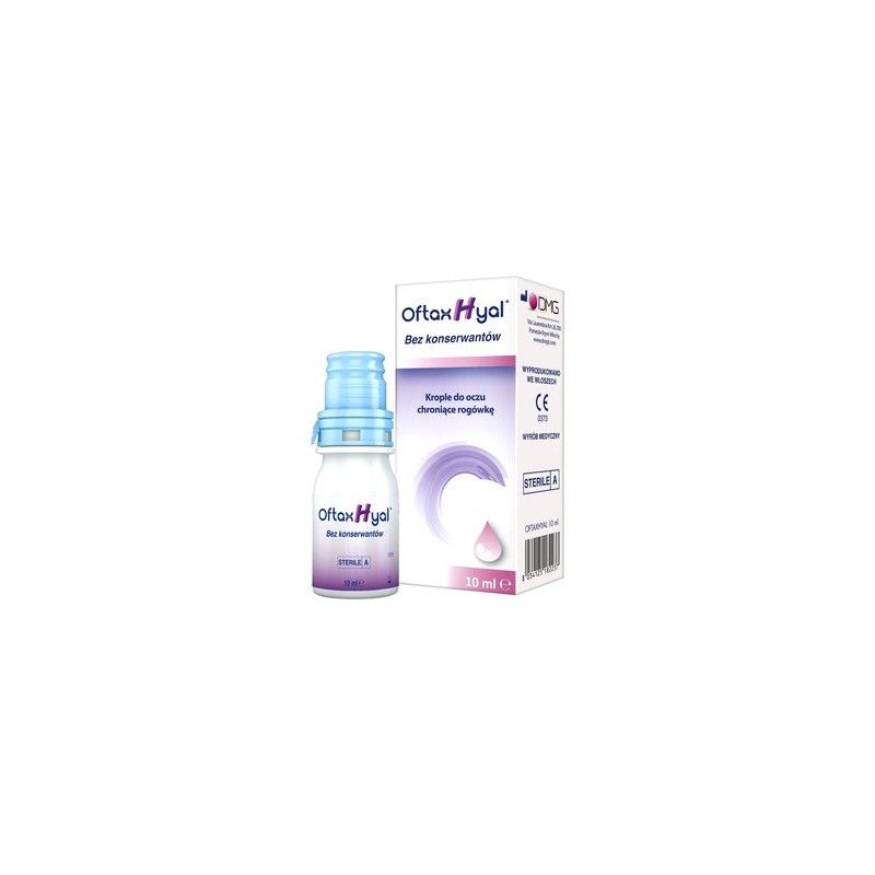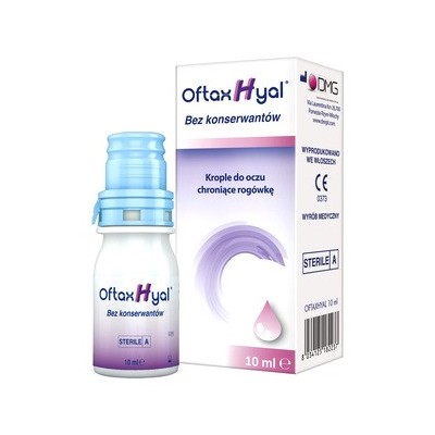 OftaxHyal, krople do oczu, wyrób medyczny. Opakowanie: Butelka 10 ml. Sposób użycia i dawkowanie: Zakraplać 1-2 krople 2-3 razy dziennie do każdego oka. Przed zastosowaniem kropli nie ma konieczności zdejmowania soczewek