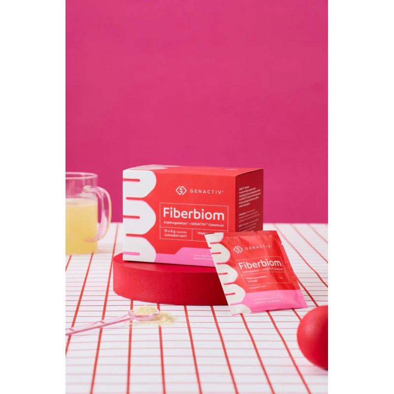 Fiberbiom to unikalne połączenie rozpuszczalnego błonnika z kory modrzewia (Arabinogalaktan) i Genactiv® Colostrum. Formuła ta, dzięki synergicznemu działaniu, wspiera mikrobiotę i barierę jelitową. Komfort trawienny pozostaje zachowany, a jednocześnie organizm otrzymuje dodatkowe wsparcie w codziennym funkcjonowaniu. Dodatkowo sprzyja utrzymaniu prawidłowego rytmu wypróżnień, wspiera naturalne mechanizmy obronne organizmu i ułatwia zachowanie dobrej kondycji przewodu pokarmowego. Regularne stosowanie Fiberbiom może przyczyniać się do lepszego przyswajania składników odżywczych i ogólnego dobrostanu. Preparat polecany jest osobom dbającym o zdrowie jelit.