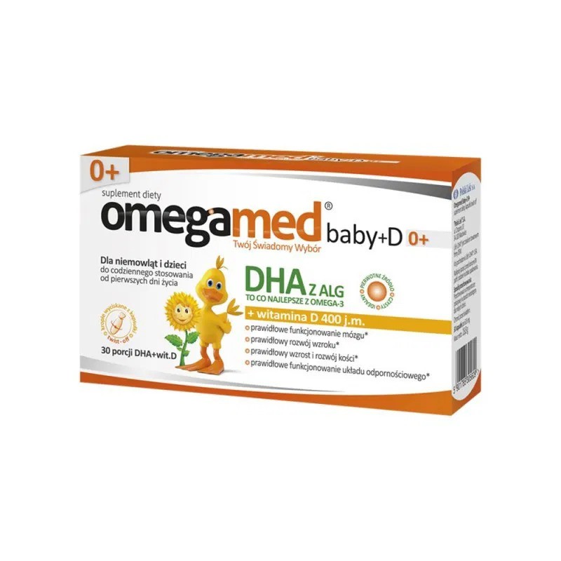 Omegamed Baby+D 0+ zapewnia codzienną porcję DHA (kwas dokozaheksaenowy z grupy Omega-3) oraz witaminy D, zgodnie z aktualnymi zaleceniami ekspertów (DHA 150 mg + witamina D 400 j.m.)*.